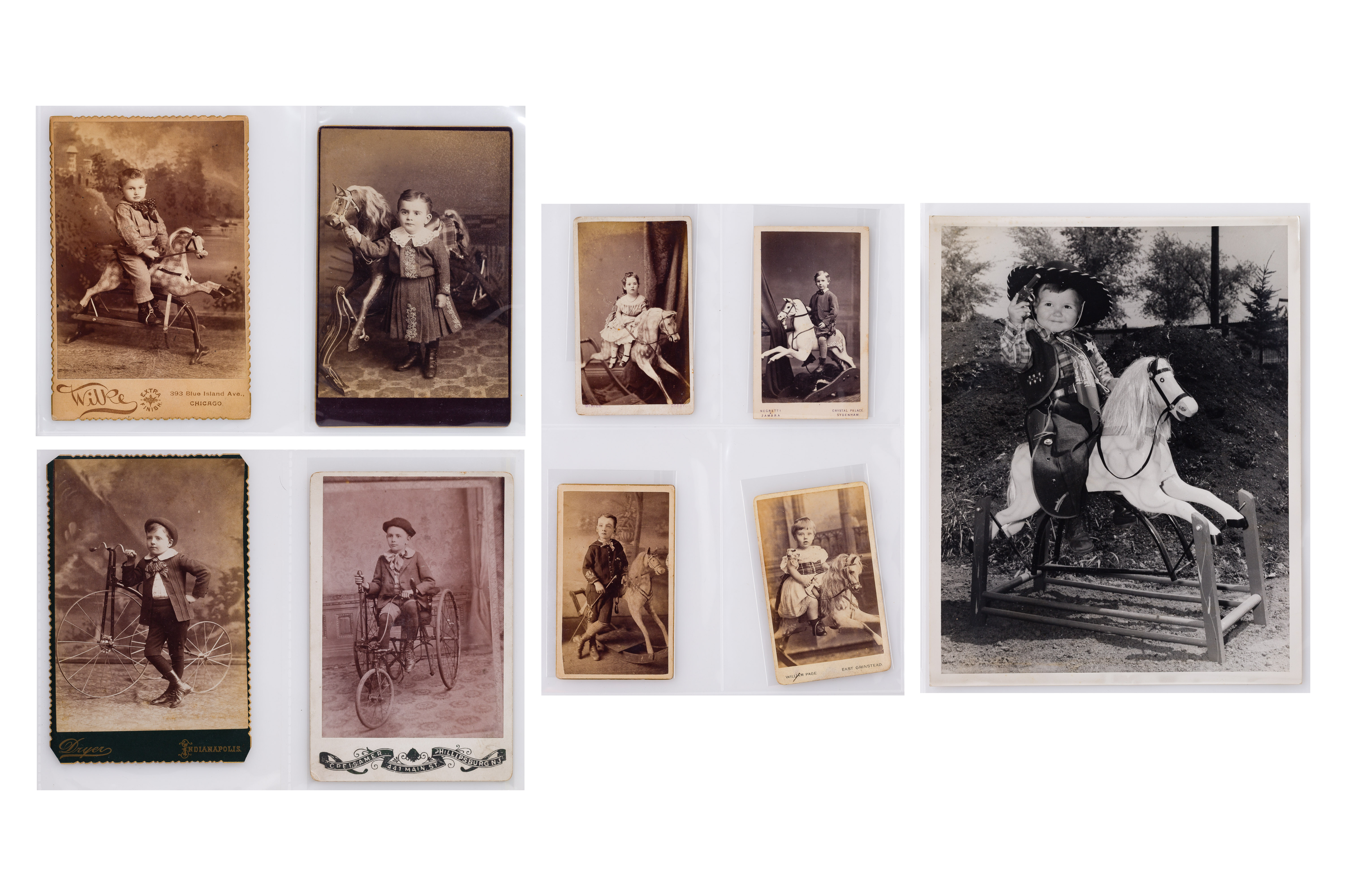 Approximately (120) items of various sizes and subjects, including postcards, cartes de visite, cabinet cards and photographs depicting children with toys, portraits, contained in two labeled binders