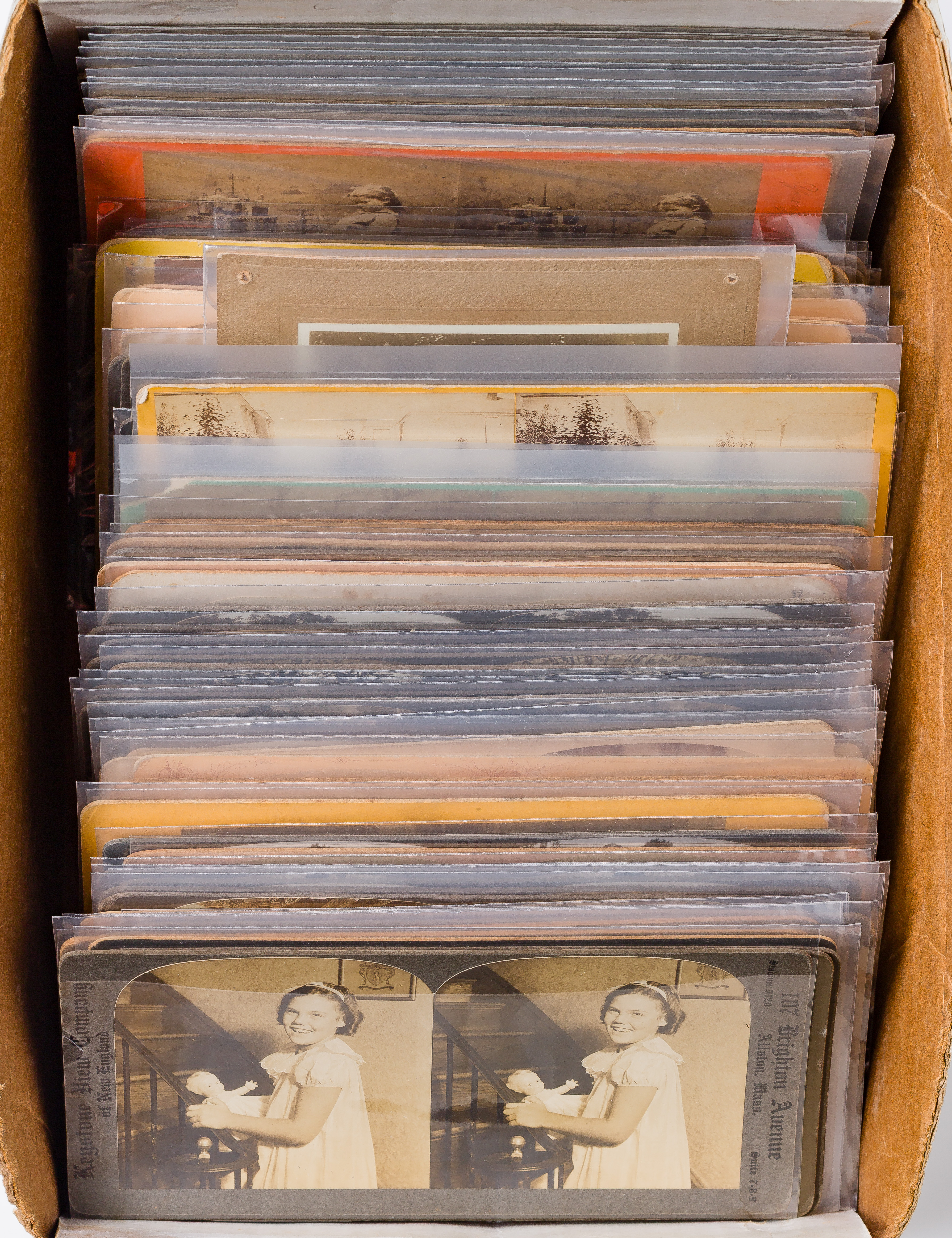 Approximately (120) items of various sizes and subjects, including postcards, cartes de visite, stereoviews and photographs, depicting twins, children with toys and pets, portraits, in three labeled binders
