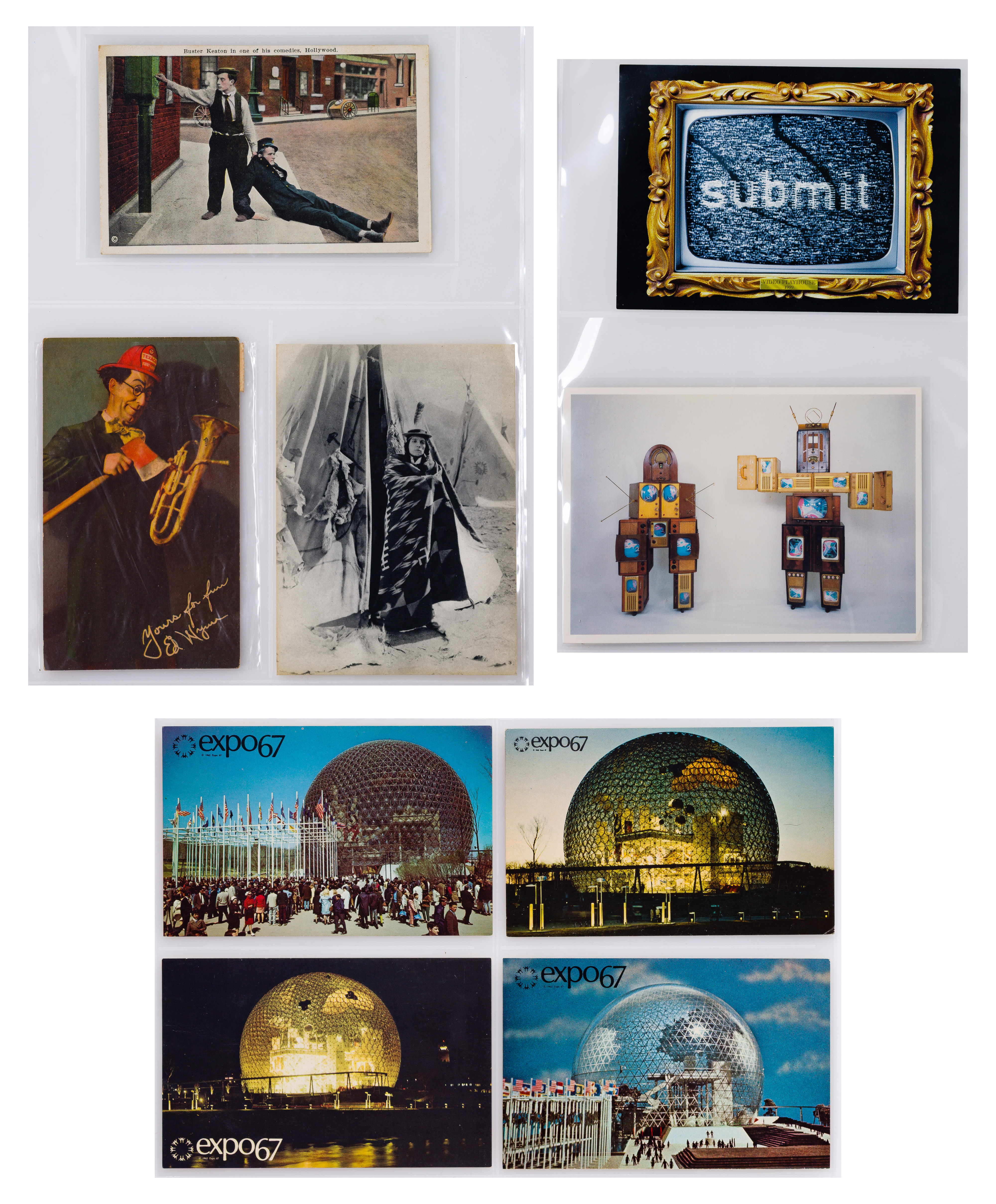 Approximately (100) items of various sizes and subjects, including postcards, cartes de visite and photographs, such as Buckminster Fuller, sea divers, silent screen actors, Carmen Miranda and her puppet, daredevils, in five labeled binders, some having signatures