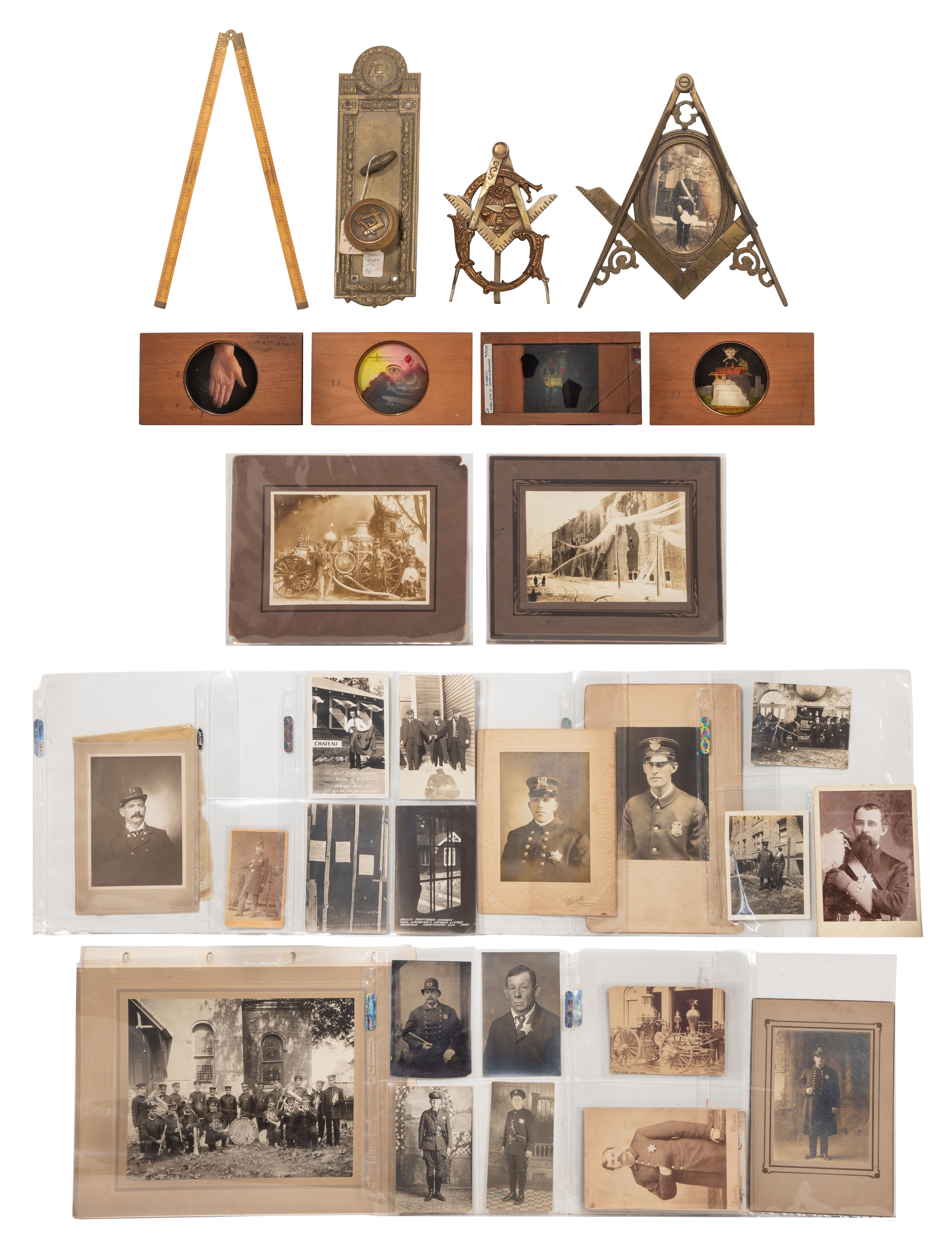 Approximately (30) total items including mounted portraits of uniformed police officers and firefighters, a mounted group shot of the Knights Templar band of Kansas City, Missouri, photographic postcards showing detained criminals and aftermath of Dillinger raid on Manitowoc, Wisconsin, other photographic images including a paddy wagon and a fire engine, a tintype noted; together with a magic lantern slide having slip mechanism depicting an organ grinder and monkey, (2) Masonic and a Knights of Malta magic lantern slides, brass Masonic motif doorknob and backplate, (2) brass Masonic frames (one having portrait) and a folding 12-inch ruler