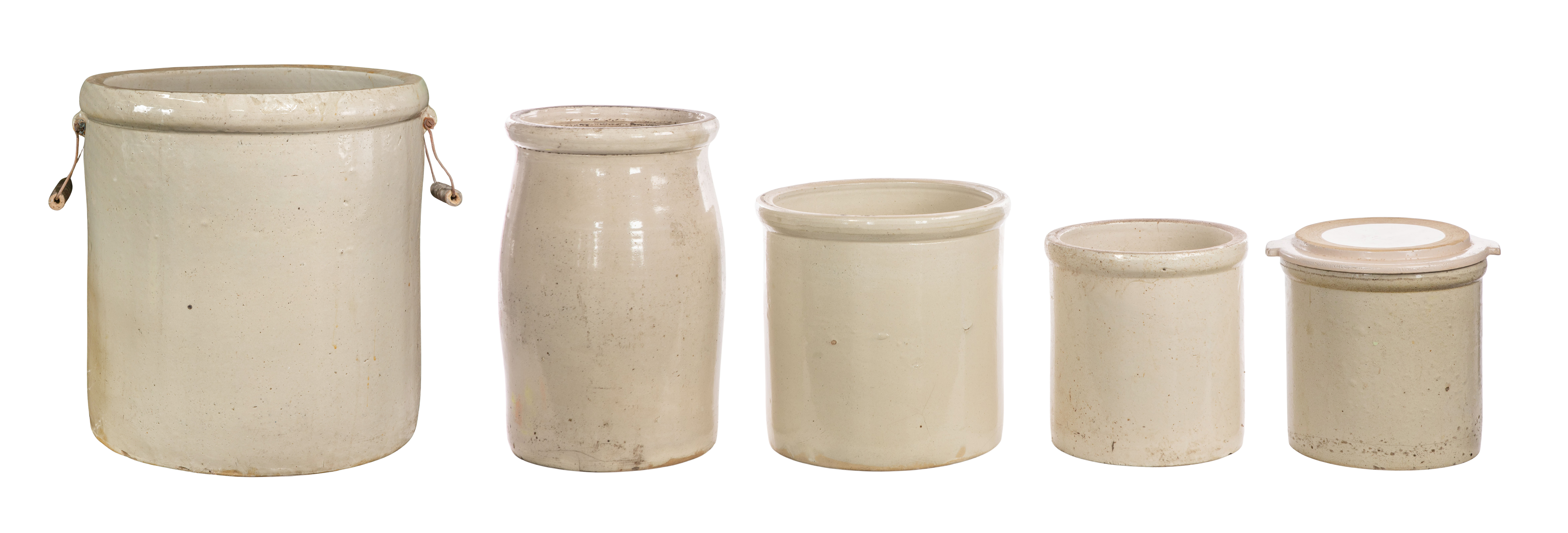 (5) items, zinc glazed having appropriate stamped marks, including 12-, 4- and (2) 2-gallon cylindrical crocks, the 12-gallon stamped ‘Patented / Dec 21st 1915’ below a wood roller on wire bale handle, a 2-gallon having a lid impressed marked ‘2’ as well as a 4-gallon butter churn (without lid)