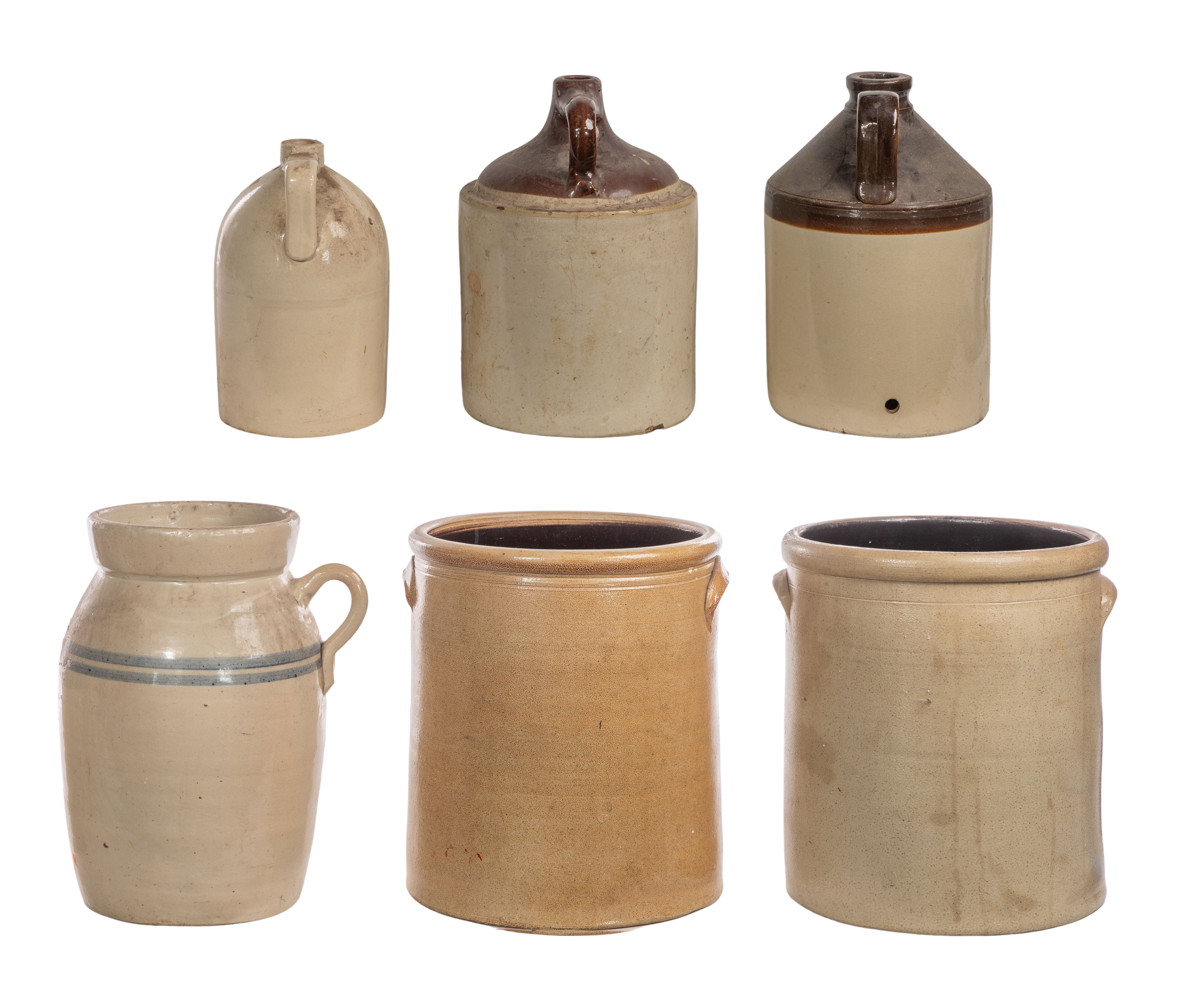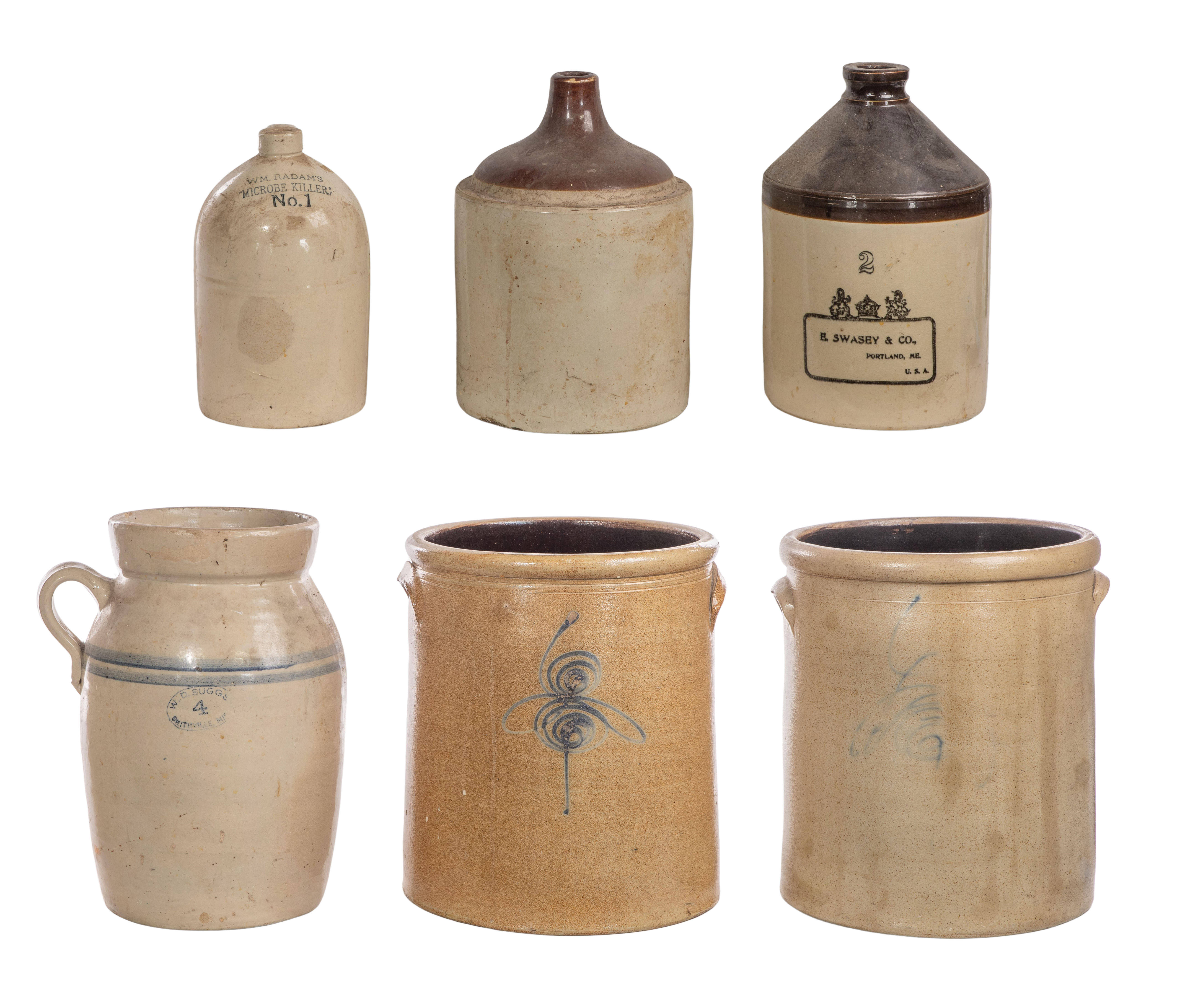 (6) items including an approximately 1-gallon jug stamped ‘Wm Radam’s / Microbe Killer / No. 1’, (2) 2-gallon jugs having brown glazed handles and tops, one unmarked and the other stamped ‘E. Swasey & Co. / Portland ME / USA’, (2) approximately 5-gallon crocks having applied handles and cobalt blue hand painted marks (one very faintly painted) and a 4-gallon handled butter churn (without lid) having cobalt blue bands and stamped ‘W. D. Suggs / 4 / Smithville ME’