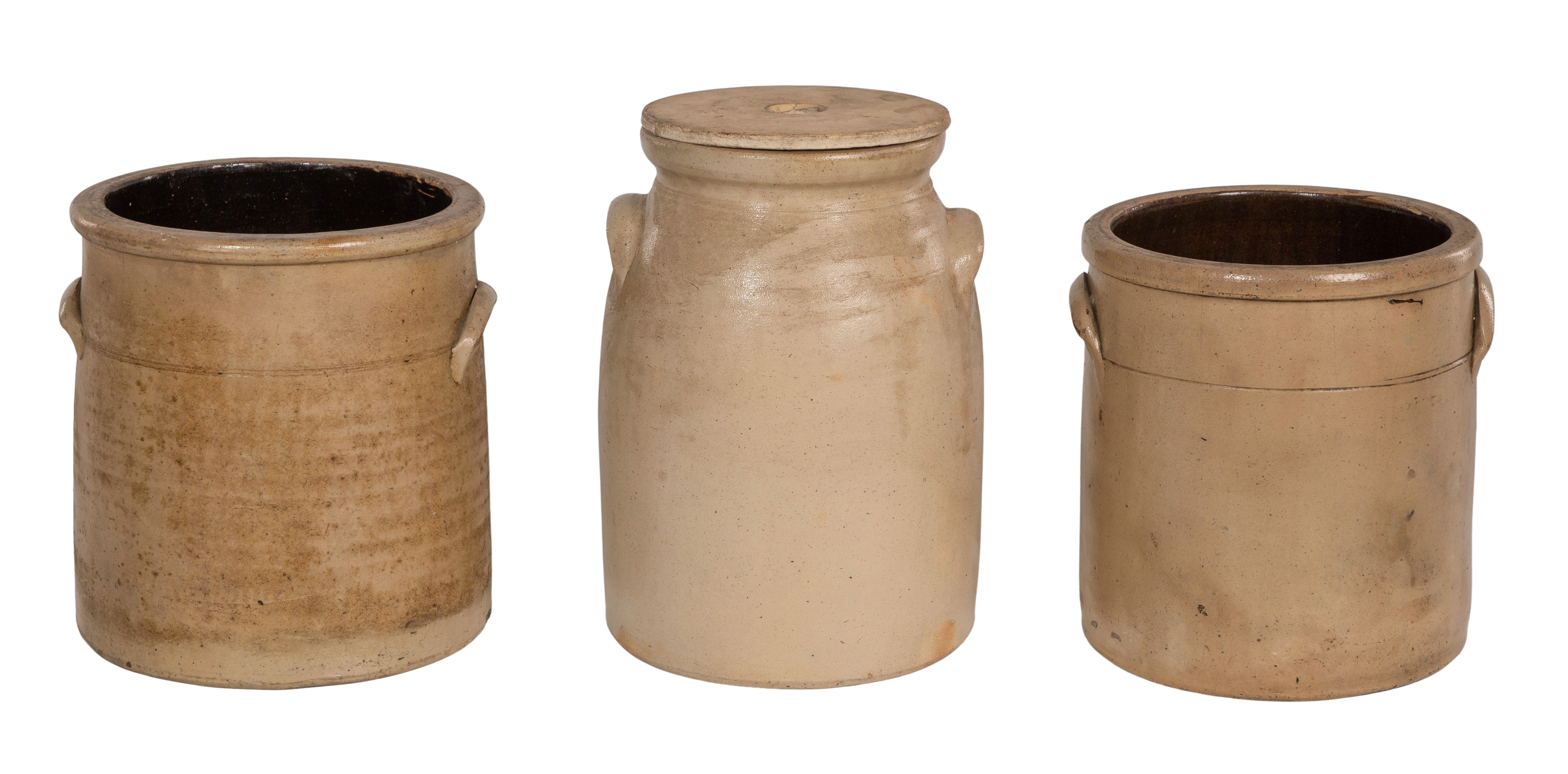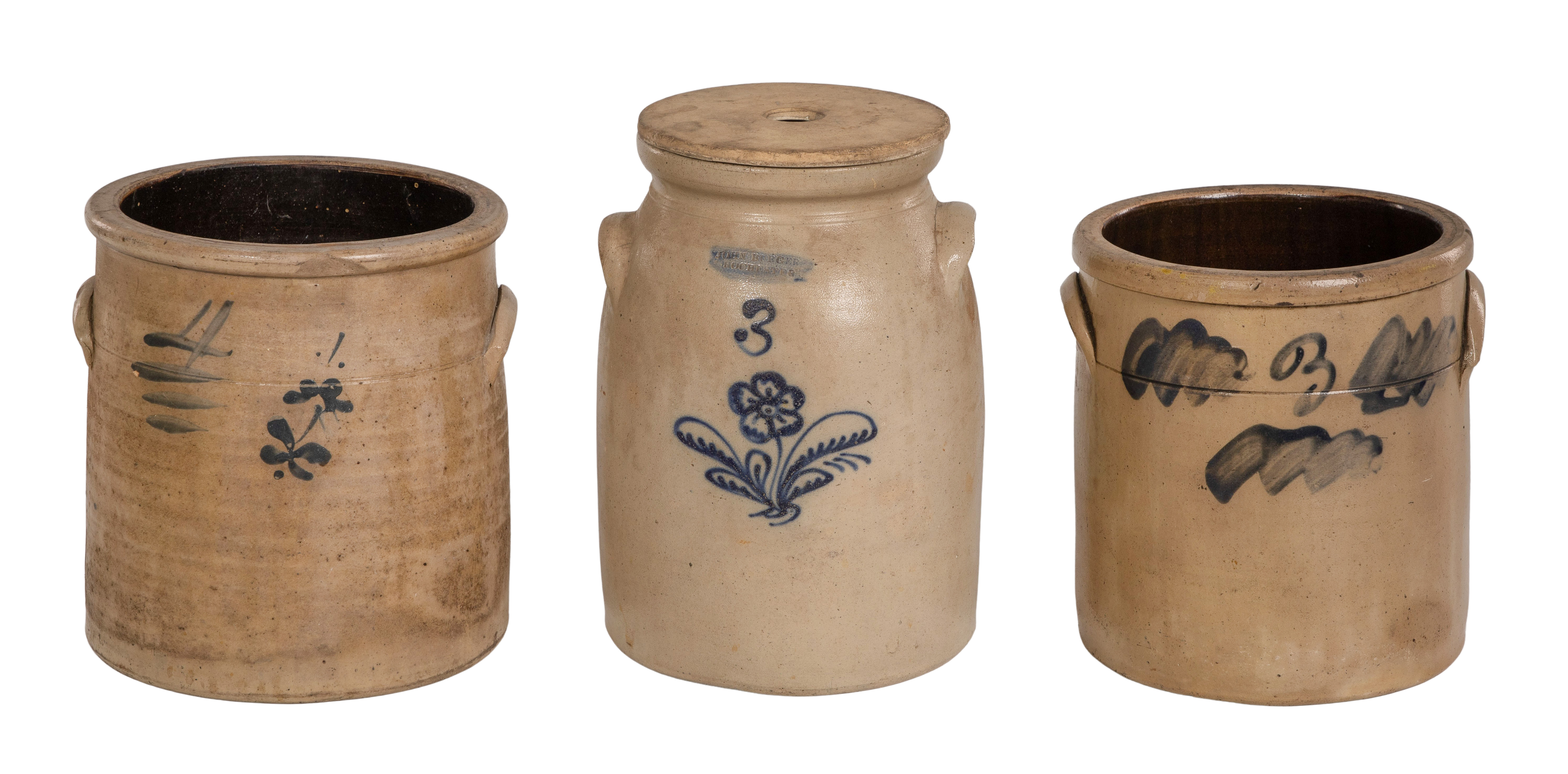 (3) items including a John Burger Rochester three-gallon with cover and applied handles, a four-gallon and a three-gallon, both with applied handles, all having underglaze blue numbers