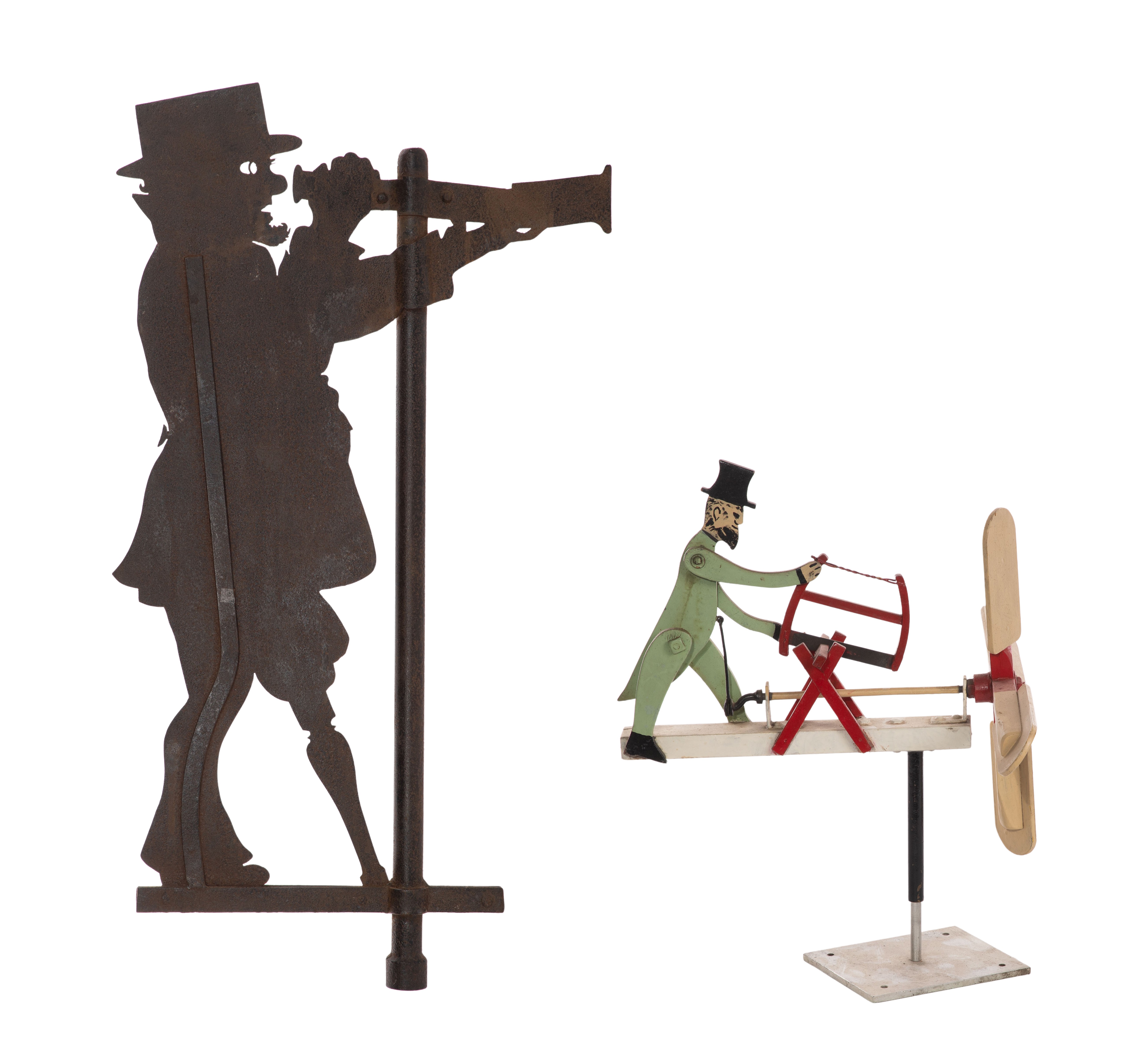 (2) items including an iron ship’s Captain having a spy glass, peg leg and the ability to rotate 360-degrees as well as a whirligig depicting a man in a green uniform and top hat, using a saw to cut wood set in a steel base