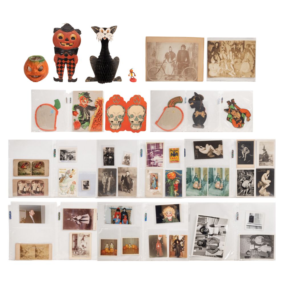 Approximately (45) items including accordion paper and other die cut items, papier mache jack-o-lantern, ephemera and photographic items including albumen prints, postcards and vernacular snapshot images
