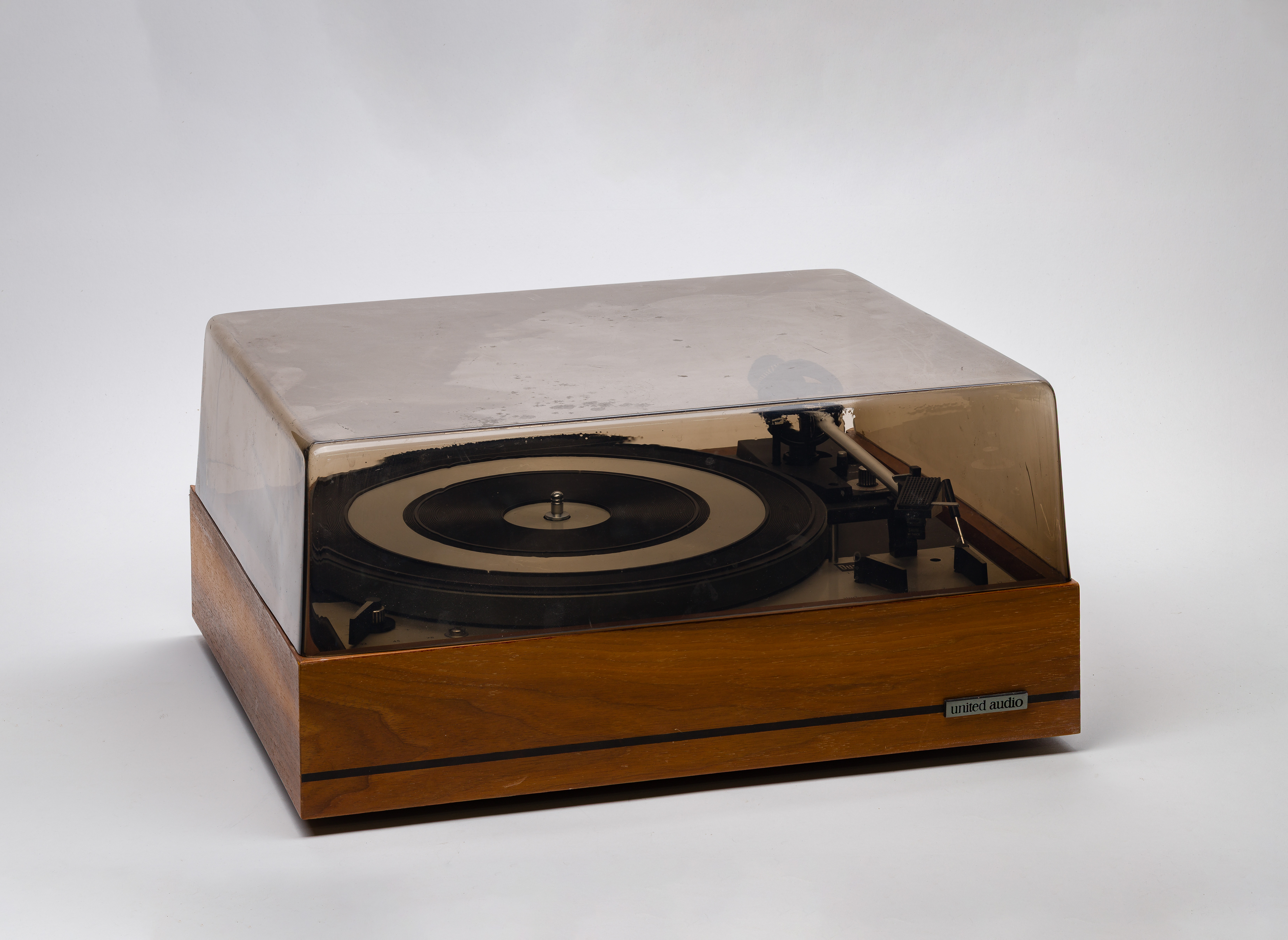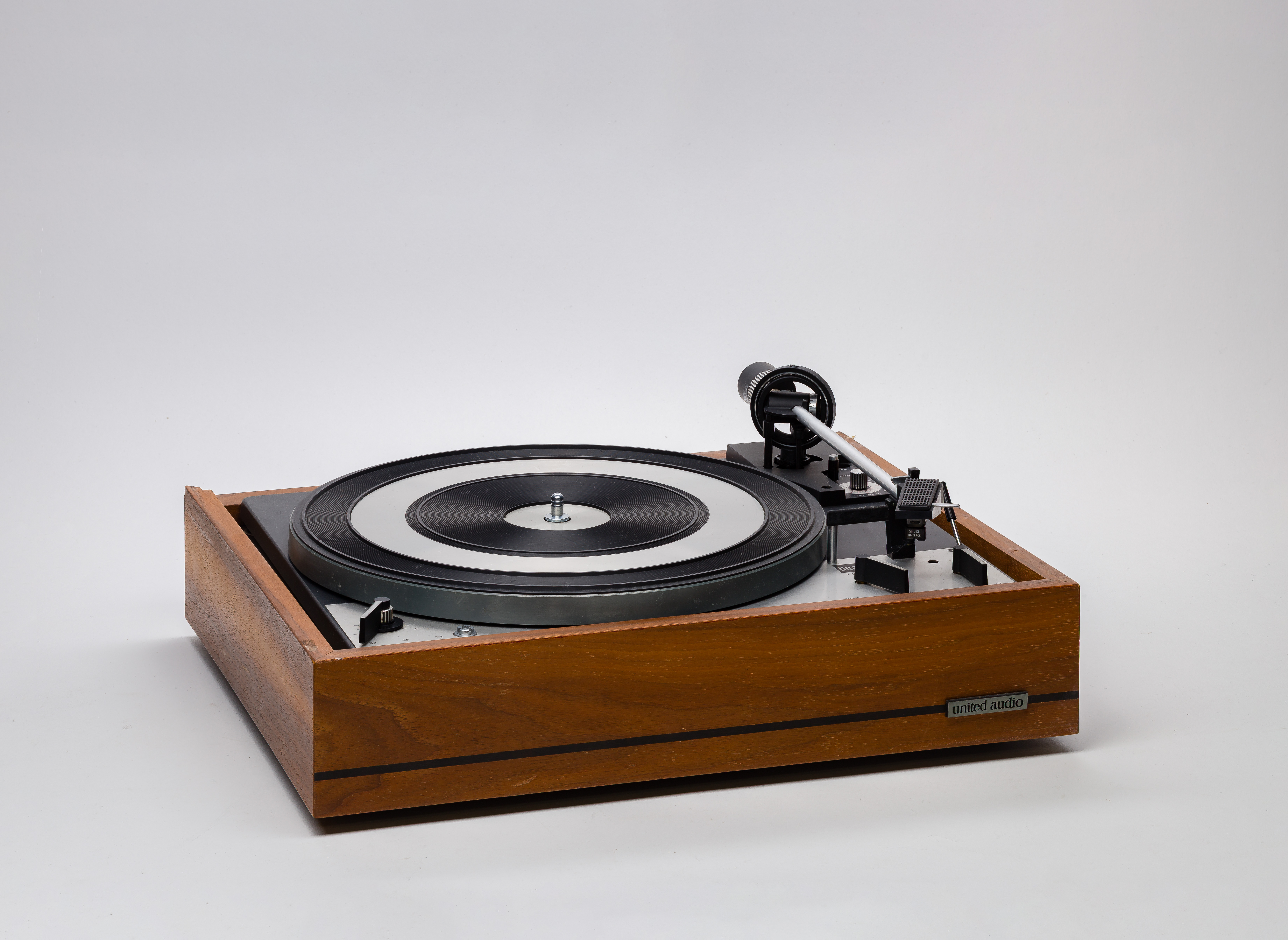 A pair of mid-century modern speakers serial #26560 and #26561 in a wood case on metal legs as well as a Limited Audio 1219 turntable